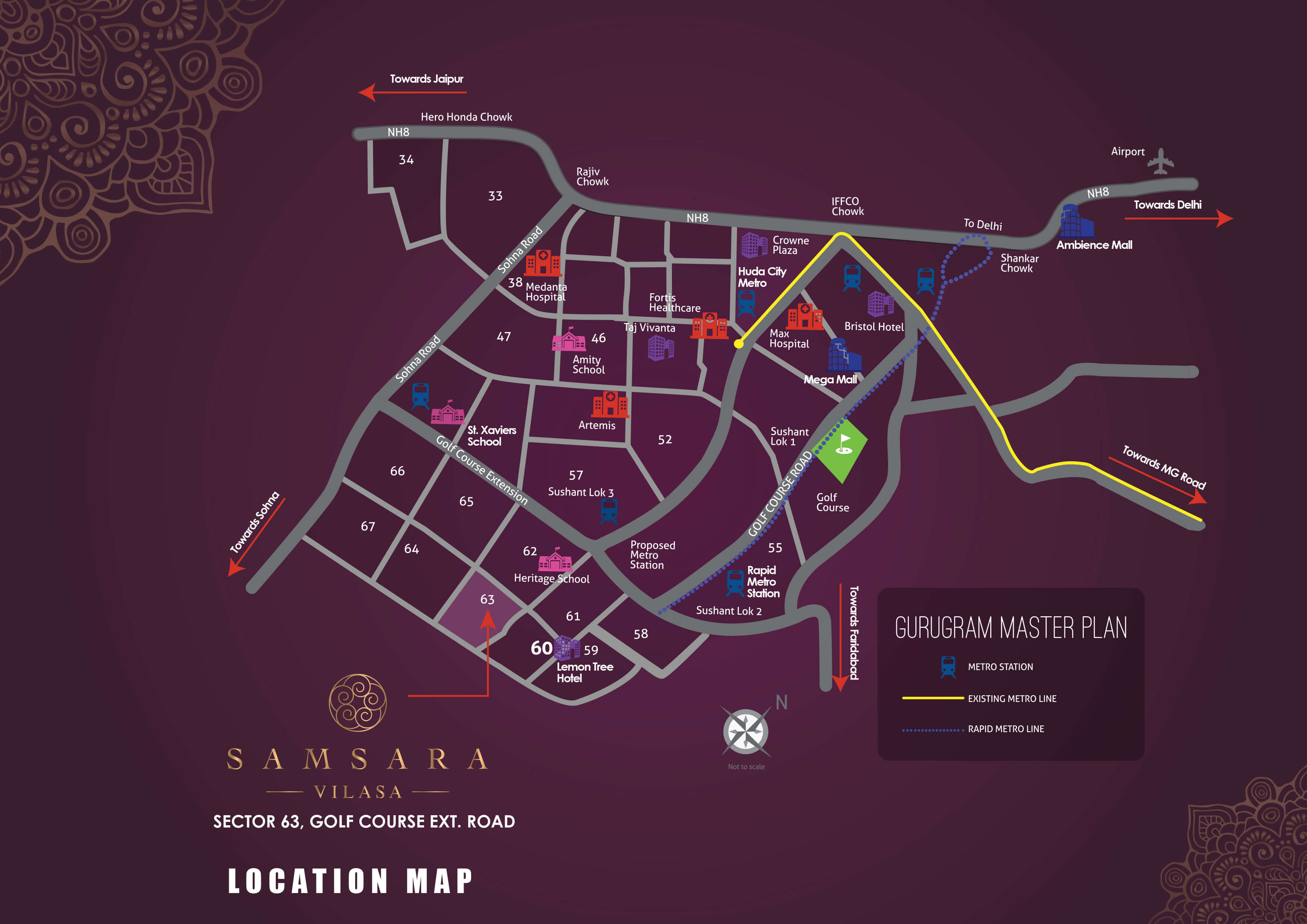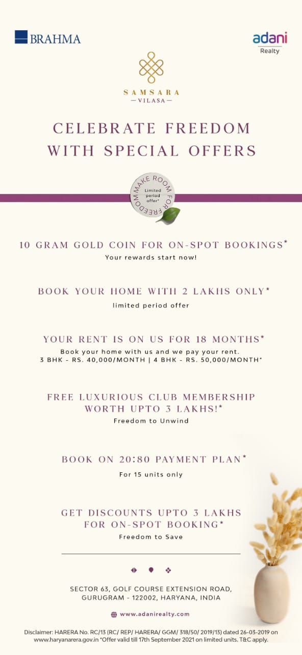Premium Floor Residences, a concept by Adani Realty & Brahma Group, located in the heart of Gurugram, offers you well planned social infrastructure, right at your doorstep. Not just spaces to live, but to nurture and harbour the warmth of a real community. In fact, the word Samsara literally means “wandering through & following on” in a perfect ecosystem that sustains, nurtures, and nourishes from within. Welcome to a new way of living. A Low rise, low density project, Samsara Vilasa is where you get to live in homes that offer the comfort and tranquillity of accessibility and safety. Samsara Vilasa offers exclusively designed Premium Floor Residences in 3 & 4 BHK configurations, with elevators and designated parking.